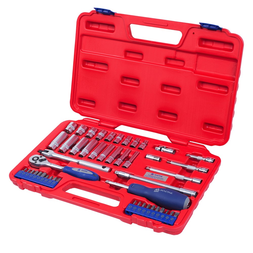 Особенности Незаменим для работы с небольшими деталями в автосервисной мастерской, станции технического обслуживания, на производстве или в быту. Качество Инструменты марки МАСТАК изготовлены из инструментальной легированной хром-ванадиевой стали специального сплава. Технология изготовления ключей и головок включает в себя метод горячей ковки с последующей термообработкой, придающим инструментам особую прочность и высокую надёжность, что даёт возможность профессионального использования набора в условиях автосервисной мастерской, станции технического обслуживания, а также на производстве. Хромированное покрытие защищает инструменты от коррозии, специальная насечка на ободке головок, рукоятках воротков и других силовых инструментов исключает проскальзывание руки при работе. Кейс, изготовленный из прочного пластика, устойчив к ударам, удобен для хранения, защищает инструмент от утери и воздействия влаги. Гарантия На инструмент марки МАСТАК распространяется пожизненная гарантия! С условиями гарантии можно озна