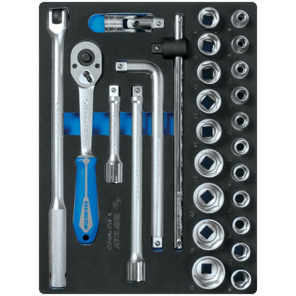 Материалы – инструментальные стали Cr-V, Cr-Mo, конструкционная сталь, хром, PP+TPR (рукояти отверки, трещотки), EVA (ложемент)