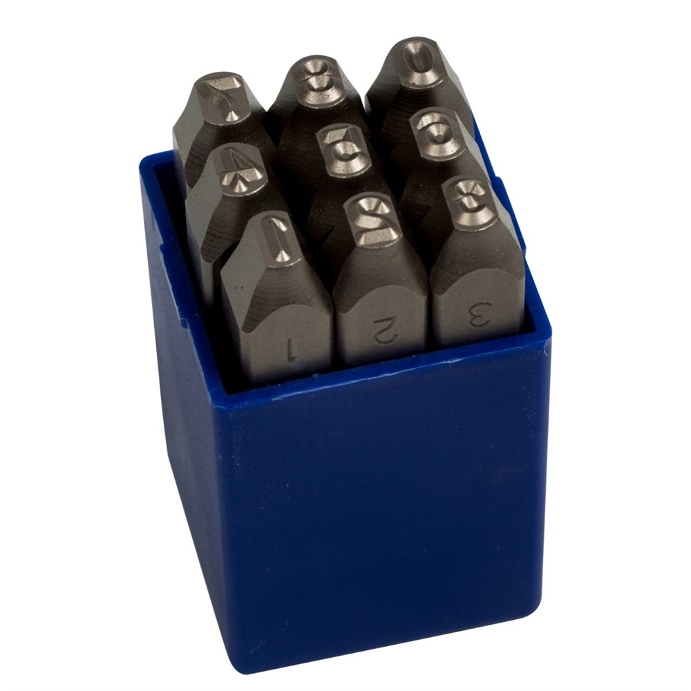Набор ударных клейм 5 мм, цифры, 9 предметов, хвостовик HRC 40 KING TONY 11509SQ05. Назначение клейм – нанесение оттиска на металлические поверхности деталей, арматуры и других предметов с целью их маркировки. Нанесение производится ударным способом. Область применения: свинец, алюминий, дюраль, медь, латунь, железо, конструкционная сталь. Качество Клейма ударные изготовлены методом гравировки из специальной легированной хром-ванадиевой инструментальной закалённой стали твёрдостью HRC60. Затылочная часть клейм обработана методом отжига и имеет меньшую твёрдость HRC40 - эта характеристика, в сочетании с увеличенной площадью сечения стержня, даёт возможность применять к инструментам большую силу удара для нанесения оттиска на стальных поверхностях, гарантируя использование инструментов в течение длительного времени без замятий и сколов. Технические характеристики Тип клейм: цифровые арабские, от 0 до 9 Количество клейм: 9 шт Размер шрифта: 5 мм Профиль стержней: квадрат 11 х 11 мм Длина стерж