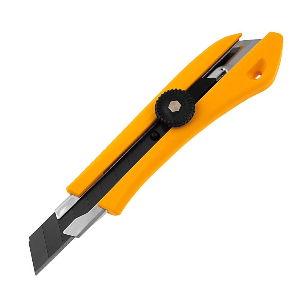 Нож оснащен винтовым фиксатором и металлической направляющей, что делает его надежным в использовании и предотвращает повреждение лезвия даже при высоких нагрузках. Сверхострое выдвижное лезвие легко справляется с различными материалами, включая линолеум, ковролин, бумагу, обои и картон.