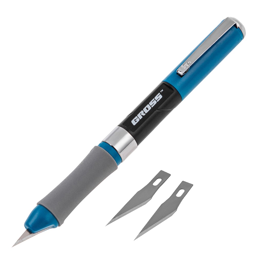 Нож для дизайна, выдвижное перовое лезвие, двухкомпонентная рукоятка, металлическая клипса для фиксации, 150 мм, 2 запасных лезвия Gross 78885