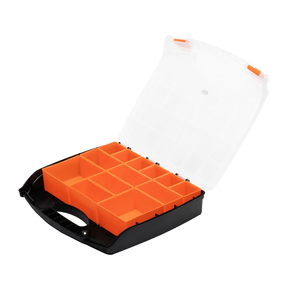 - Удобство транспортировки: Защелки и встроенная ручка делают перемещение органайзера легким и удобным.