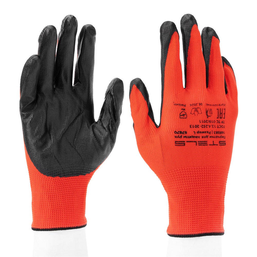 Перчатки полиэфирные с черным нитрильным покрытием маслобензостойкие, L, 15 класс вязки Stels 67870