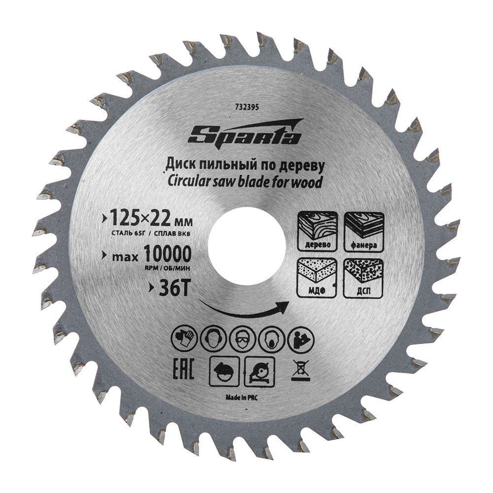 Пильный диск по дереву, 125 х 22 мм, 36 зубьев Sparta 732395