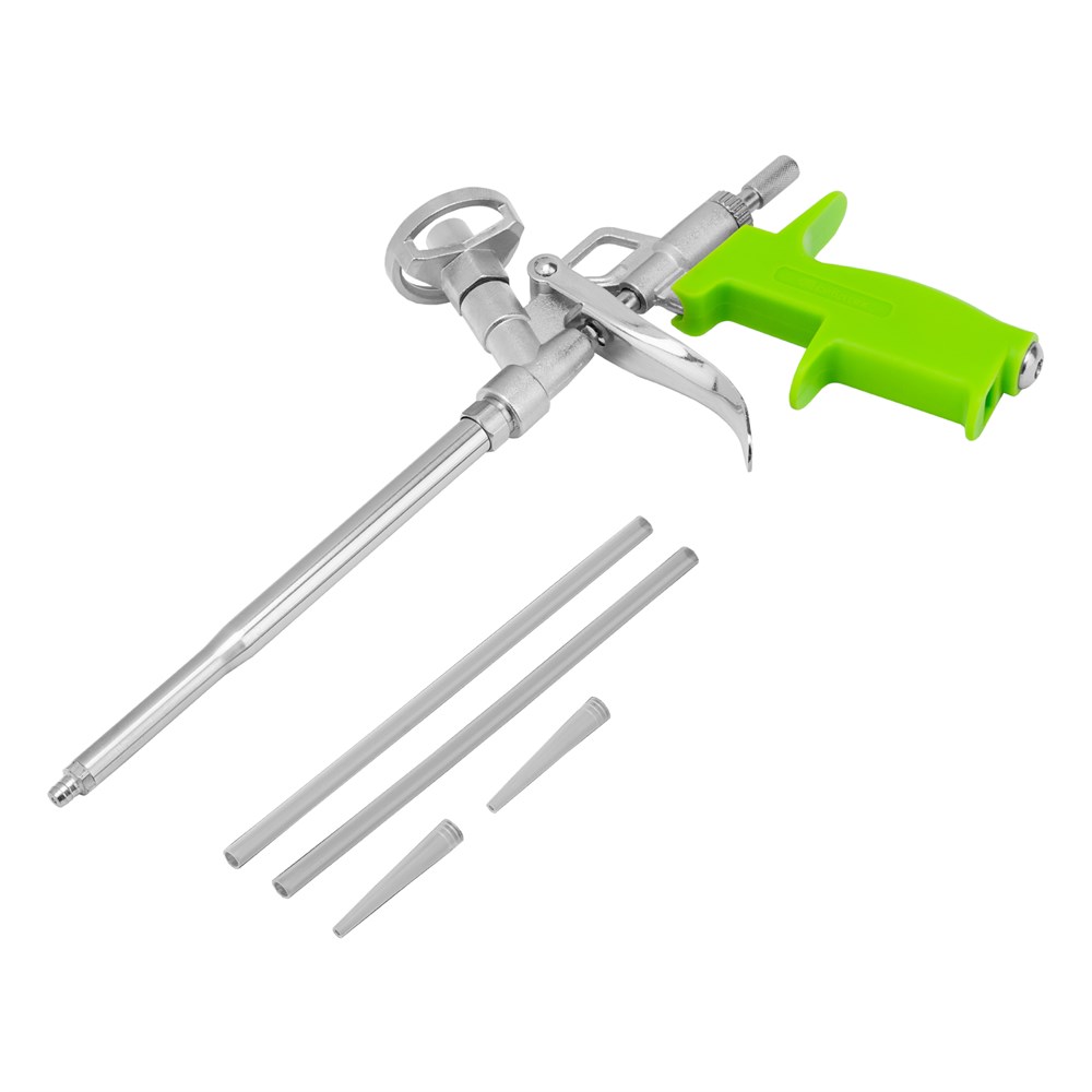 - Контроль скорости и объема: предусмотрен трещоточный винт-регулятор для удобного регулирования выхода монтажной пены.