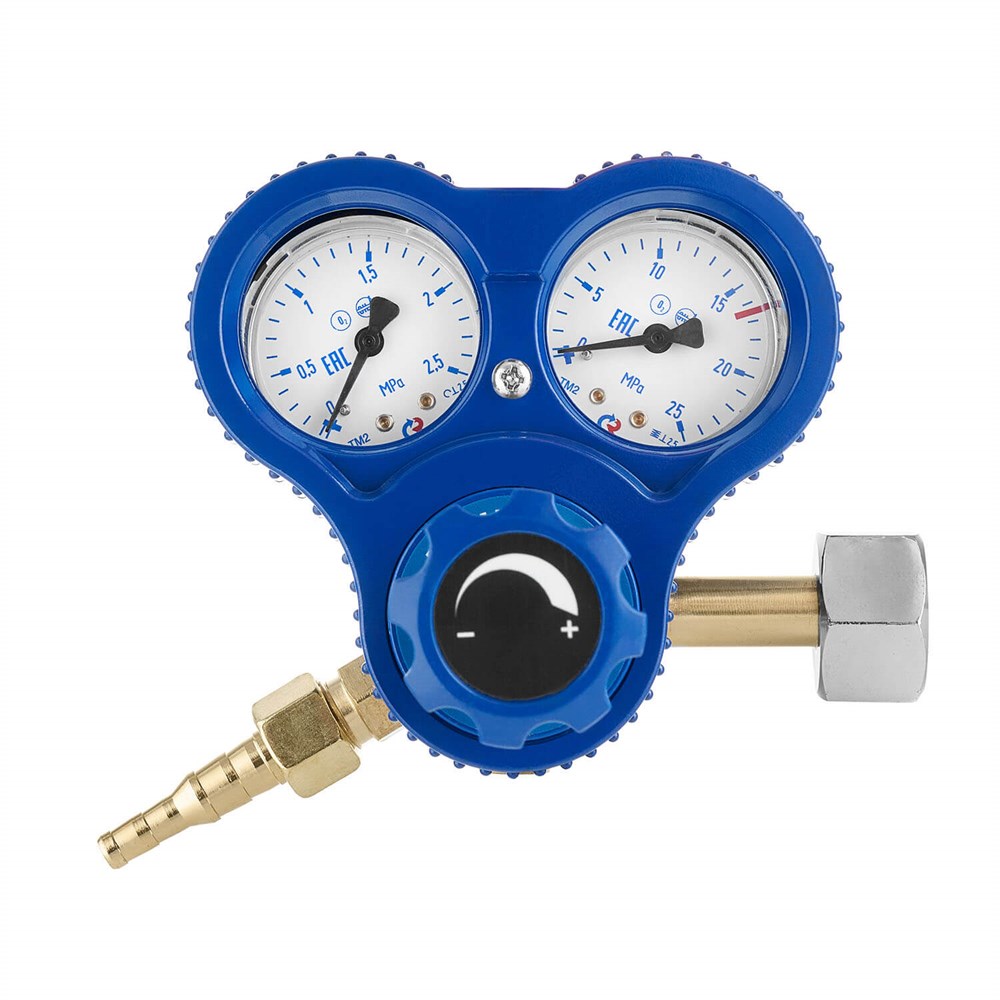 Редуктор обладает высокой пропускной способностью до 50 м³/ч и надежно работает при максимальном давлении на входе до 20 МПа и рабочем давлении 1,25 МПа. Защитный клапан обеспечивает безопасность при использовании устройства, что делает редуктор идеальным выбором для профессионалов в сварочной и газопламенной области.
