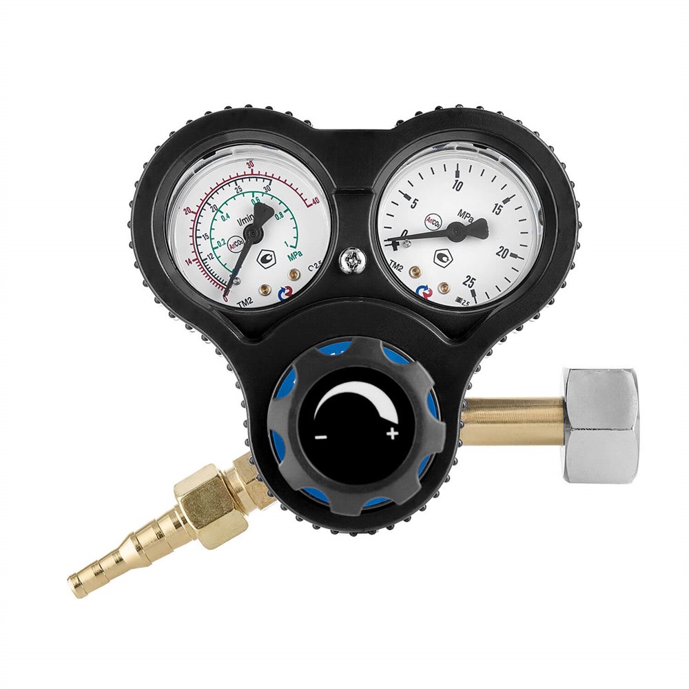 Регулятор оснащён манометрами для углекислоты и аргона, обеспечивая точное отображение расхода газа. Манометр имеет две цветные шкалы: красная шкала показывает расход в литрах в минуту для аргона, а чёрная - для углекислоты, что позволяет легко ориентироваться в показаниях.