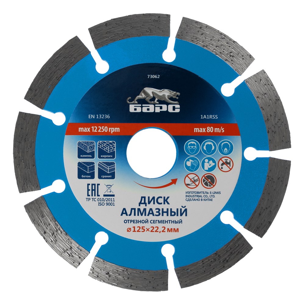 Диск алмазный Барс 73062 предназначен для профессионального использования. Он обеспечивает высокую производительность и долговечность при резке различных твердых материалов, что делает его идеальным выбором для строителей и ремонтников.