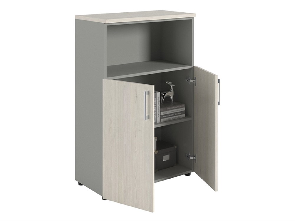 Шкаф ПРАКТИК NW 1280/2 полузакрытый белое дерево/серый К35599351218 — это практичное решение для хранения в офисах и дома, сочетающее открытые полки и закрытые секции для удобного доступа к вещам.