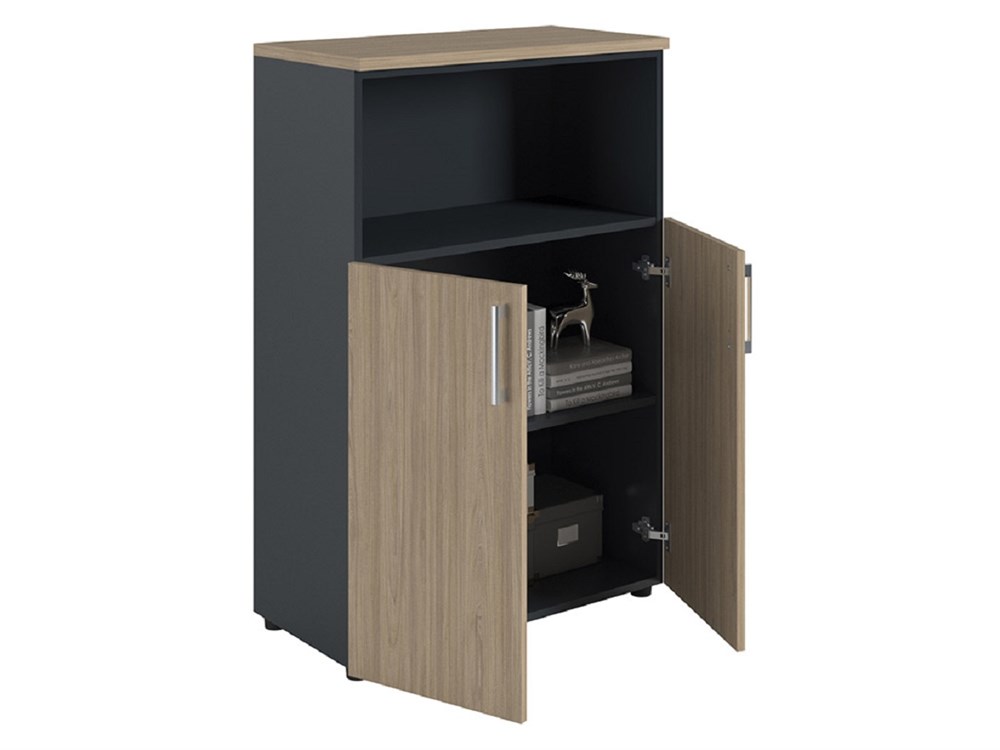 Шкаф ПРАКТИК NW 1280/2 полузакрытый вяз натуральный/антрацит К35599351216 — это практичное решение для хранения в офисах и дома, сочетающее открытые полки и закрытые секции для удобного доступа к вещам.