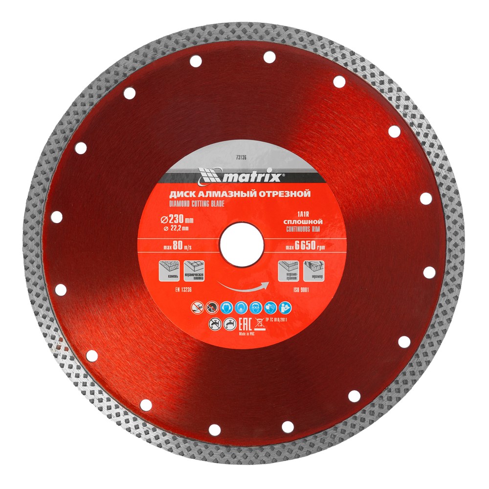 Сплошной отрезной алмазный диск Matrix 73136 диаметром 230 мм предназначен для болгарок и плиткорезов. Он идеально подходит для выполнения задач, связанных с резанием мрамора, как натурального, так и искусственного камня, а также керамогранитной и керамической плитки. Диск может использоваться как при сухом, так и при мокром резе. Использование без подачи воды расширяет возможности инструмента, однако для увеличения ресурса диска рекомендуется применять водяное охлаждение.