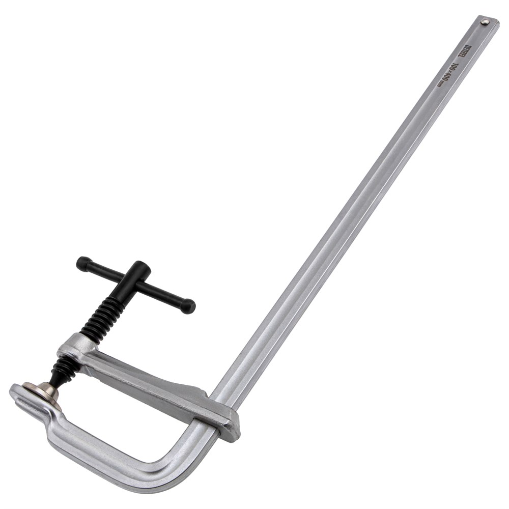 Корпус струбцины изготовлен из конструкционной стали 45 методом ковки и закален до твердости 38-42 HRC, что обеспечивает высокую прочность и долговечность. Тавровый профиль гарантирует устойчивость конструкции к изгибу, что позволяет использовать инструмент с значительными усилиями.