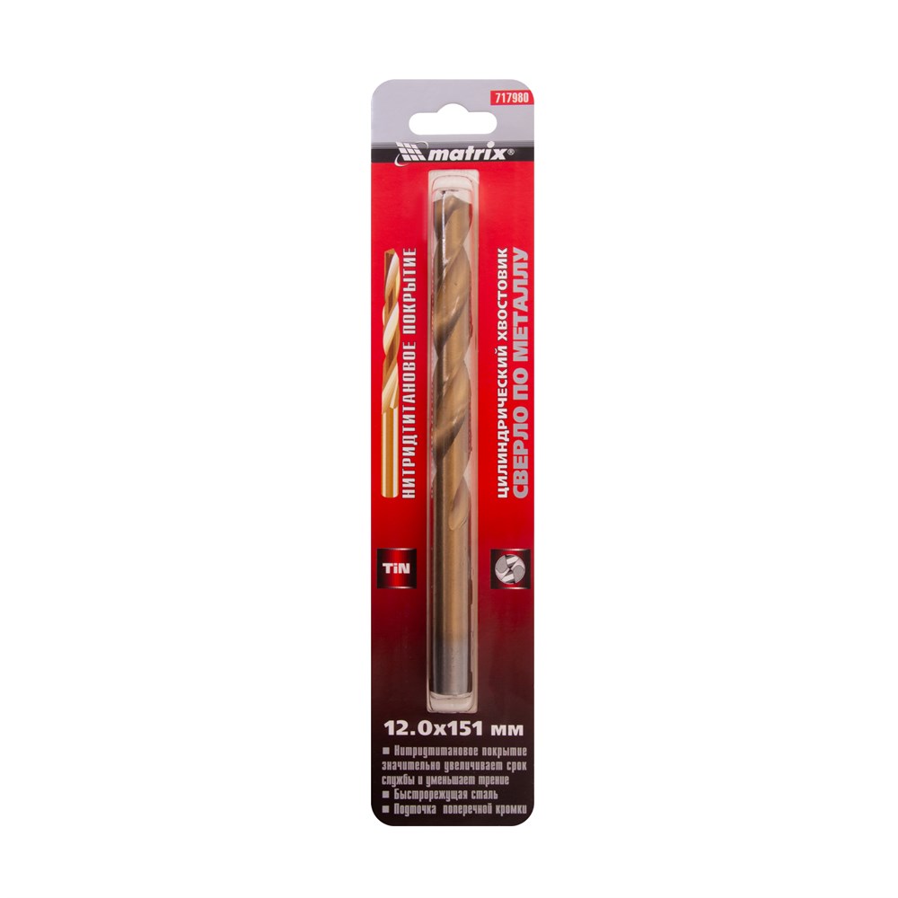 Сверло по металлу, 12 мм, HSS, нитридтитановое покрытие, цилиндрический хвостовик Matrix 717980