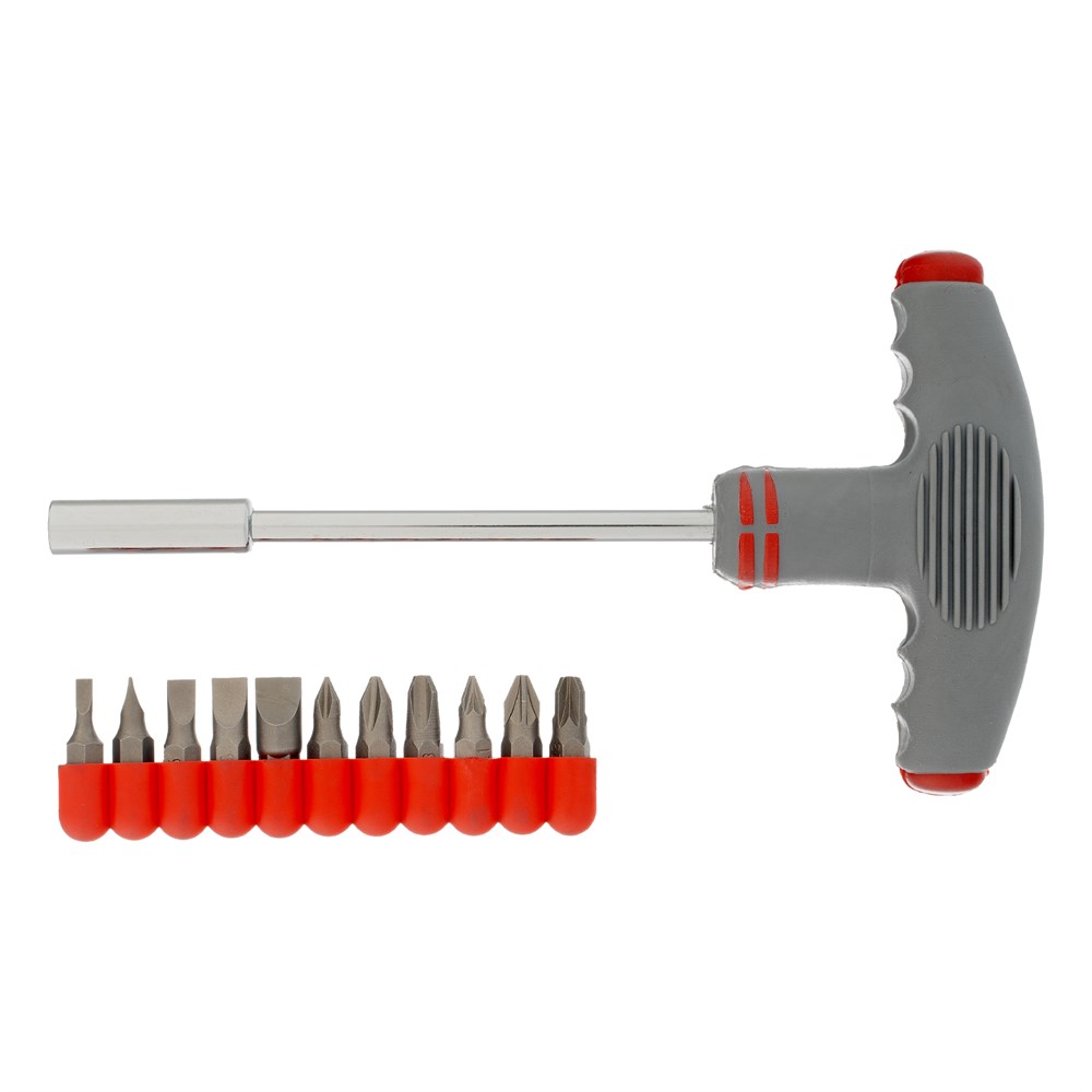Отвертка предназначена для закручивания и откручивания резьбового крепежа. В комплект входят самые распространенные по размеру и типу бит, включая шлицы PH, PZ и SL. Уникальная Т-образная рукоятка позволяет снизить усилия при использовании, что значительно облегчает работу с инструментом.