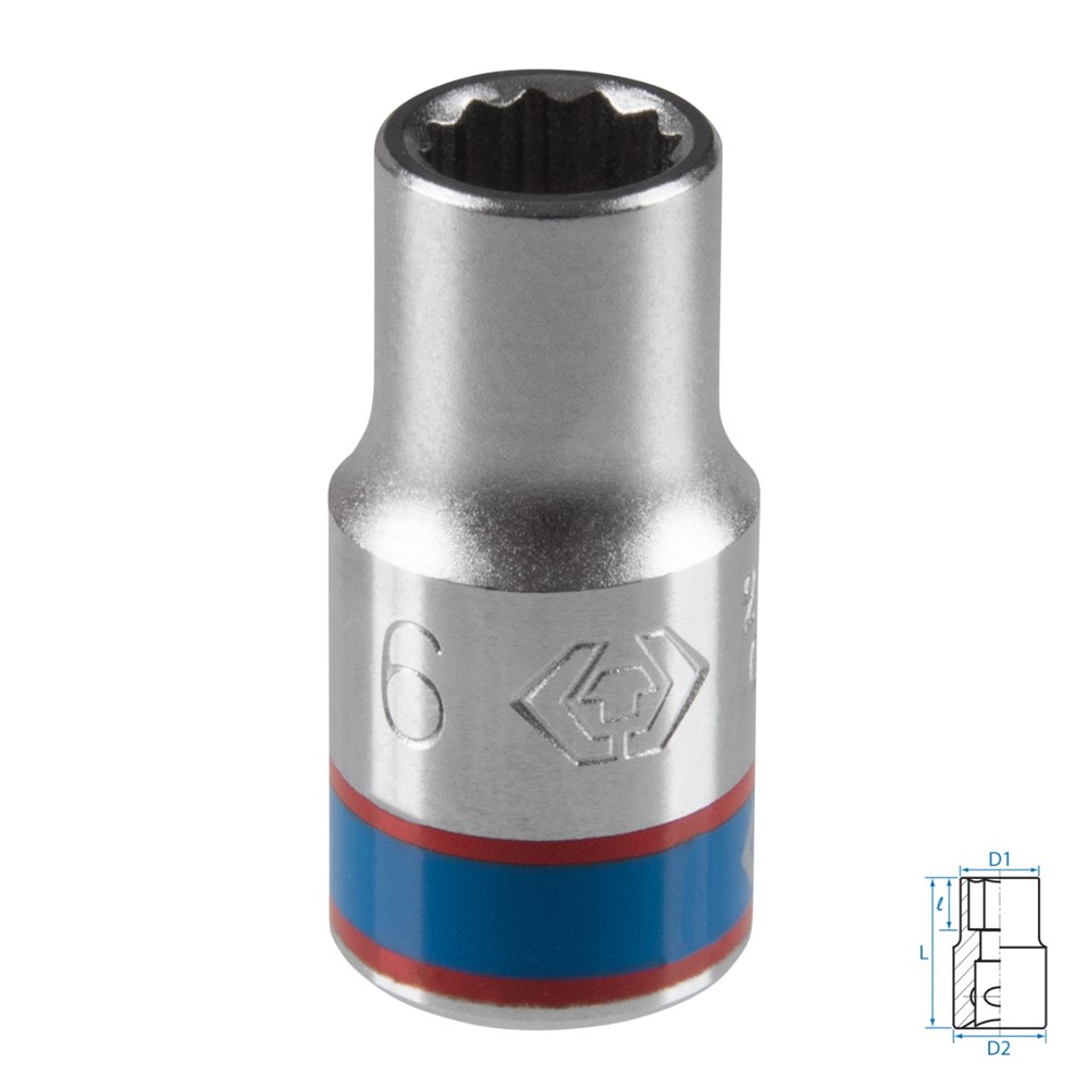 Технические характеристики Размер – 6 мм Посадочный квадрат – 1/4" Рабочий профиль – 12-гранный Рабочий диаметр (D1) – 9,2 мм Диаметр в основании (D2) – 11,8 мм Рабочая глубина (l) – 7,0 мм Общая длина (L) – 24,0 мм Материалы – инструментальная сталь Cr-V, хром, LDPE (упаковочный пакет) Размеры – 24,0×11,8×11,8 мм Вес – 0,011 кг Страна-изготовитель – Тайвань