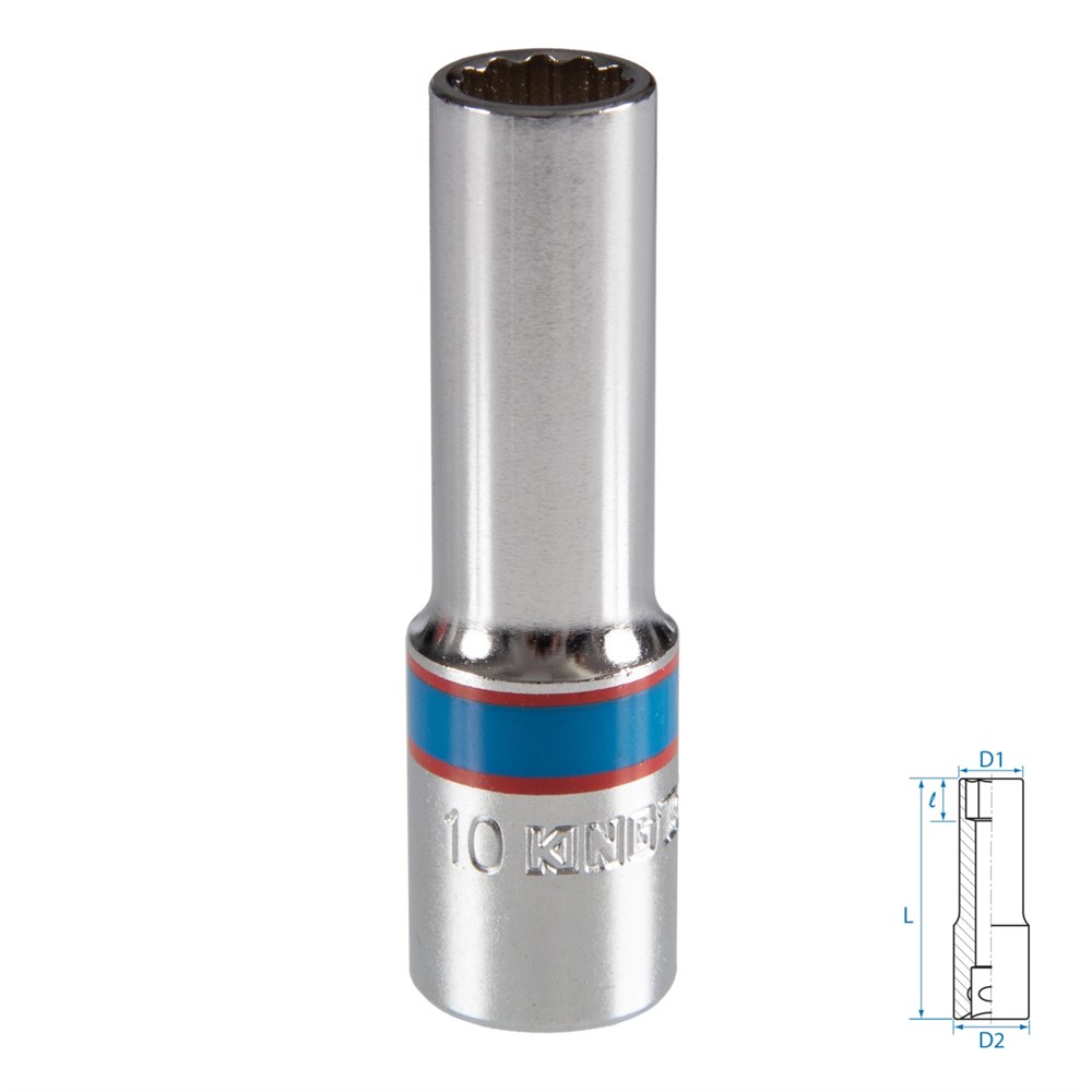 Технические характеристики Размер – 10 мм Посадочный квадрат – 3/8" Рабочий профиль – 12-гранный Рабочий диаметр (D1) – 14,5 мм Диаметр в основании (D2) – 17,8 мм Рабочая глубина (l) – 12,0 мм Общая длина (L) – 63,0 мм Материалы – инструментальная сталь Cr-V, хром, LDPE (упаковочный пакет) Размеры – 63,0×17,8×17,8 мм Вес – 0,056 кг Страна-изготовитель – Тайвань
