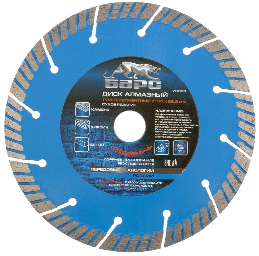 Диск алмазный, Турбо-сегментный 180 х 22.2 мм, сухая резка Барс 73088