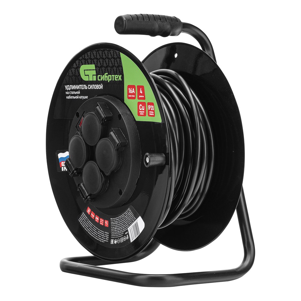 Удлинитель силовой 20 м, 16А, тип УХз16, ПВС 3 x 2.5 мм, на стальной катушке, 4 розетки Сибртех