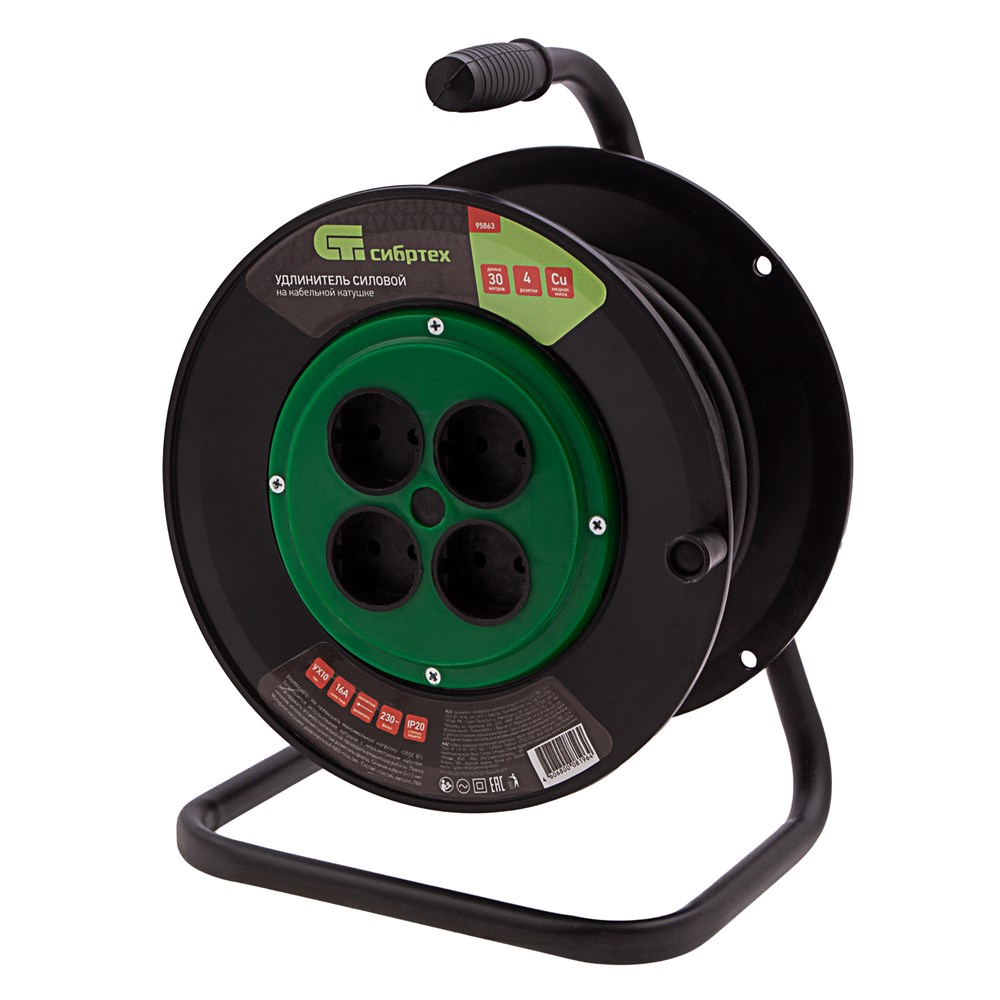 Удлинитель силовой 30 м, 16А, тип УХ10, ПВС, на кабельной катушке, 4 розетки без заземления Сибртех 95863