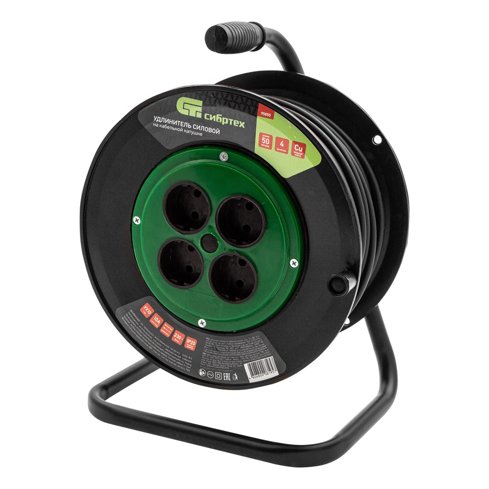 Удлинитель силовой 50 м, 10А, тип УХ10, ПВС, на кабельной катушке, 4 розетки без заземления Сибртех 95855