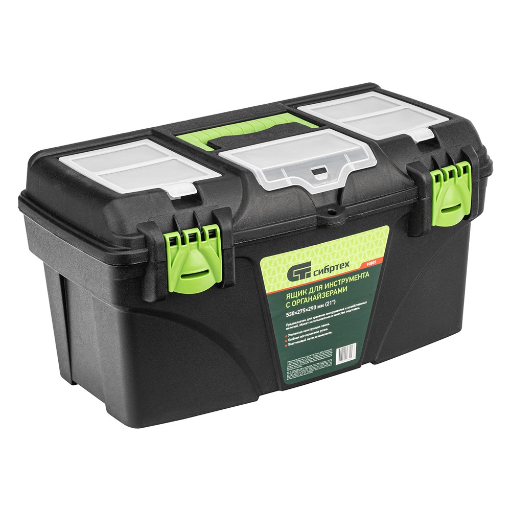 Ящик для инструментов Сибртех 90809 — это надежное и удобное решение для хранения и транспортировки различных инструментов, оснастки, крепежа и мелочей. С длиной 21 дюйм и наличием органайзеров в крышке, этот ящик обеспечивает оптимизацию пространства и удобство в использовании.